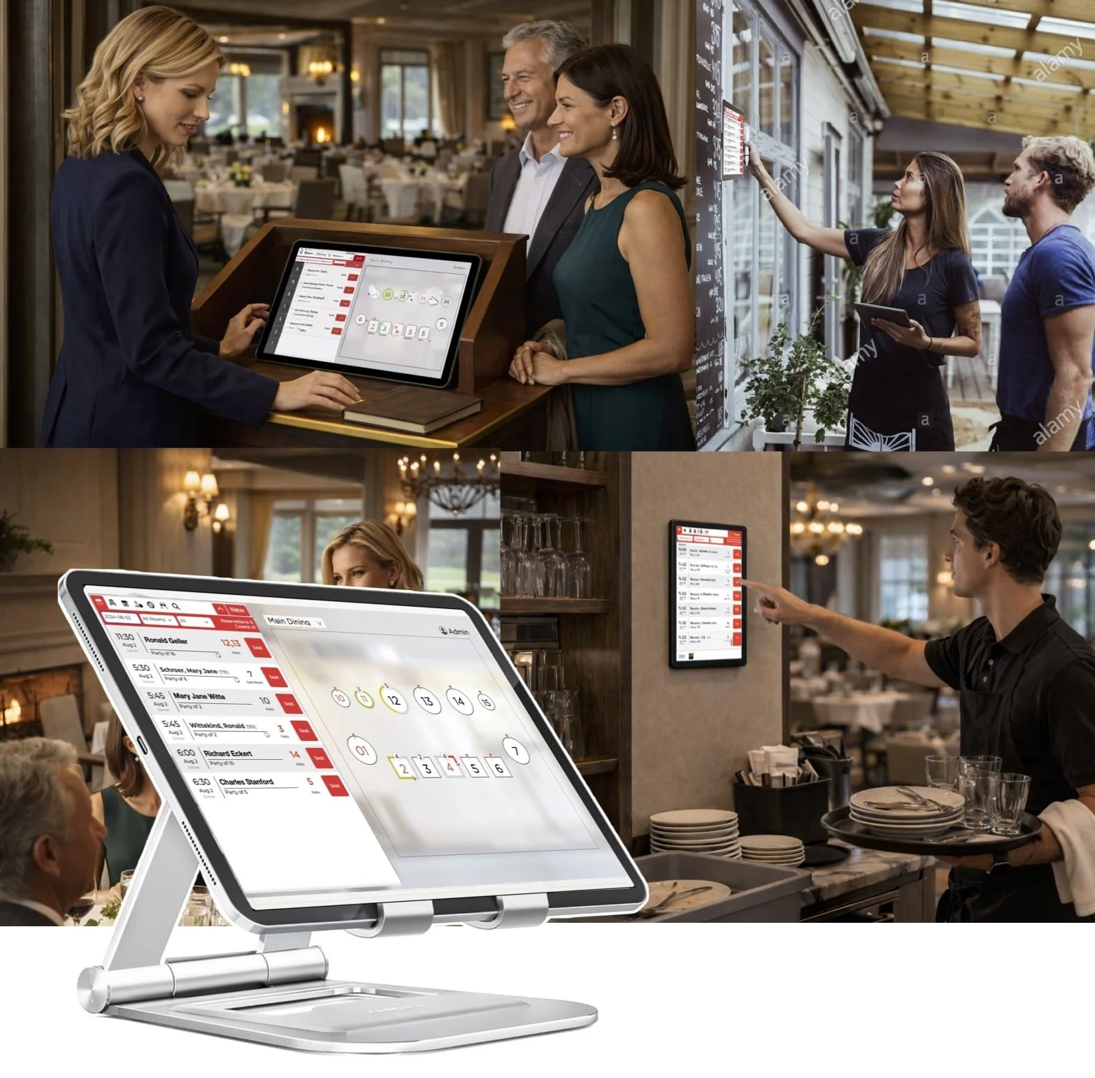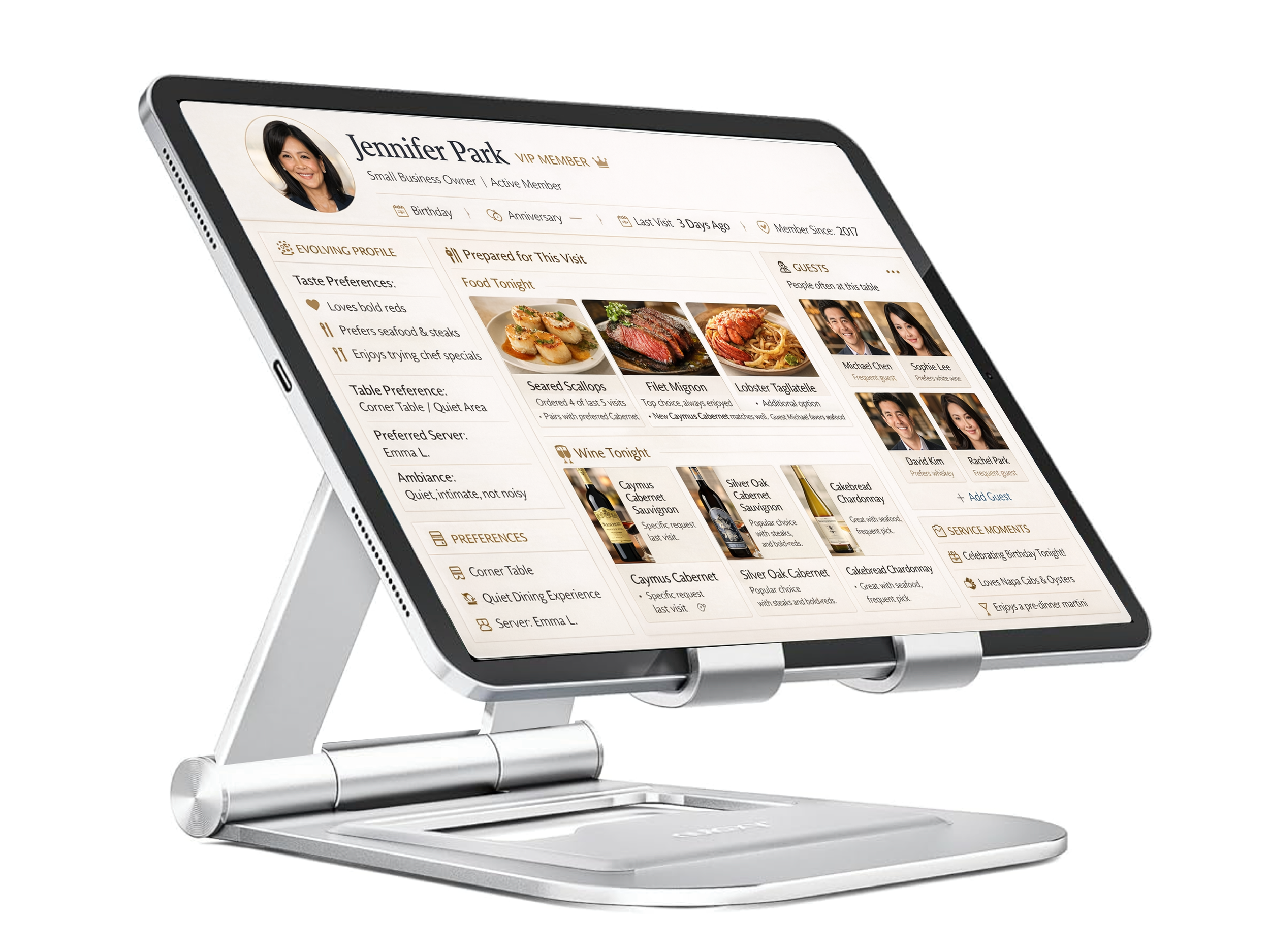 The Rarify hostess tablet is connected to server and busser tablets throughout the club, providing real-time status updates in every room and station on arriving members, tables to be set up, seated, bussed and closed.